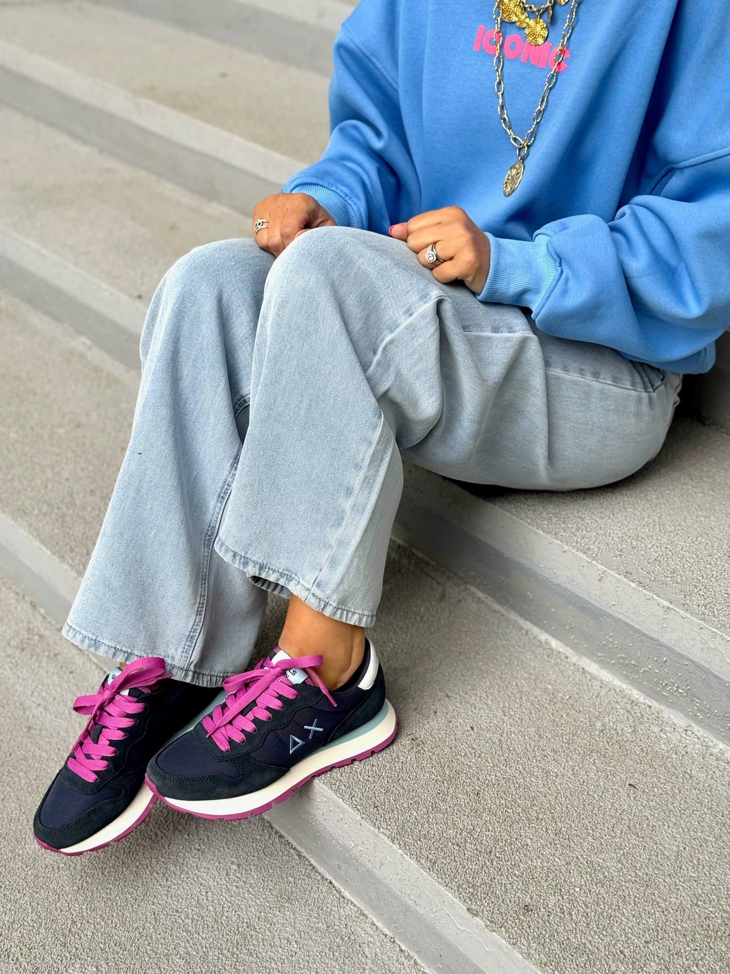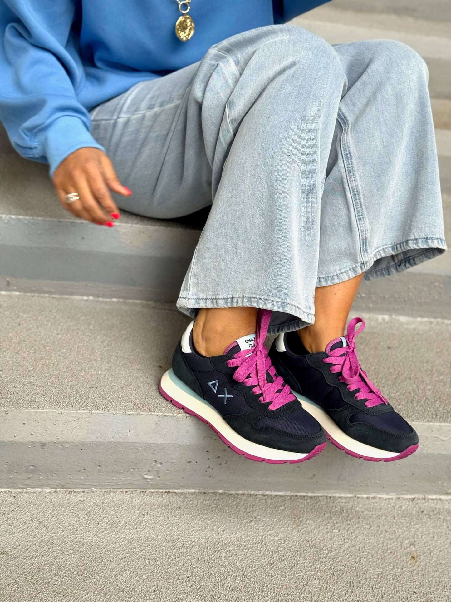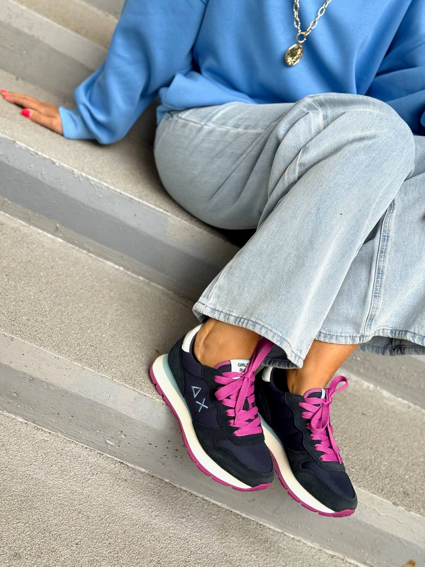 La paire de baskets est vendue avec deux paires de lacets : une mangenta et une bleu marine.