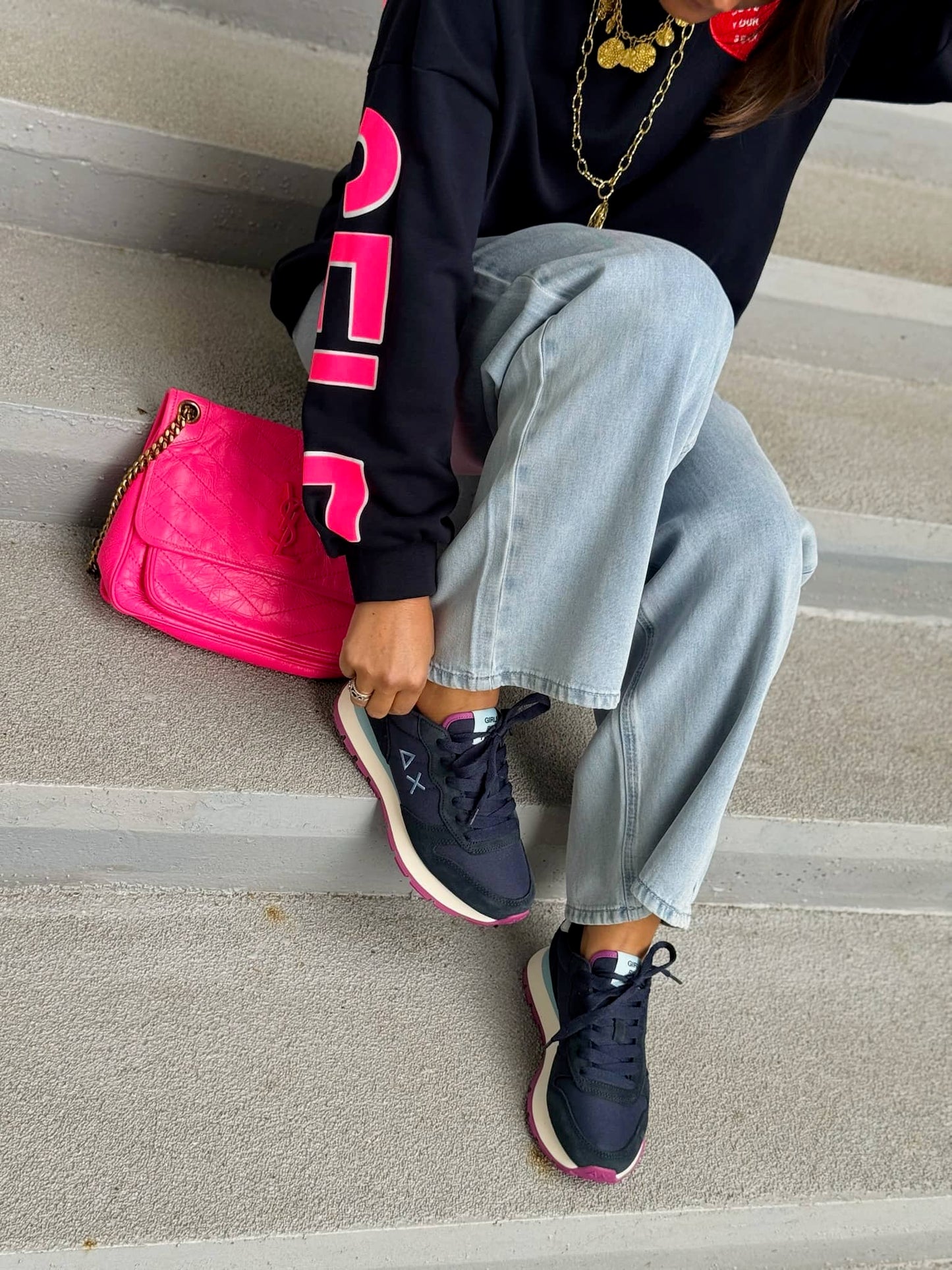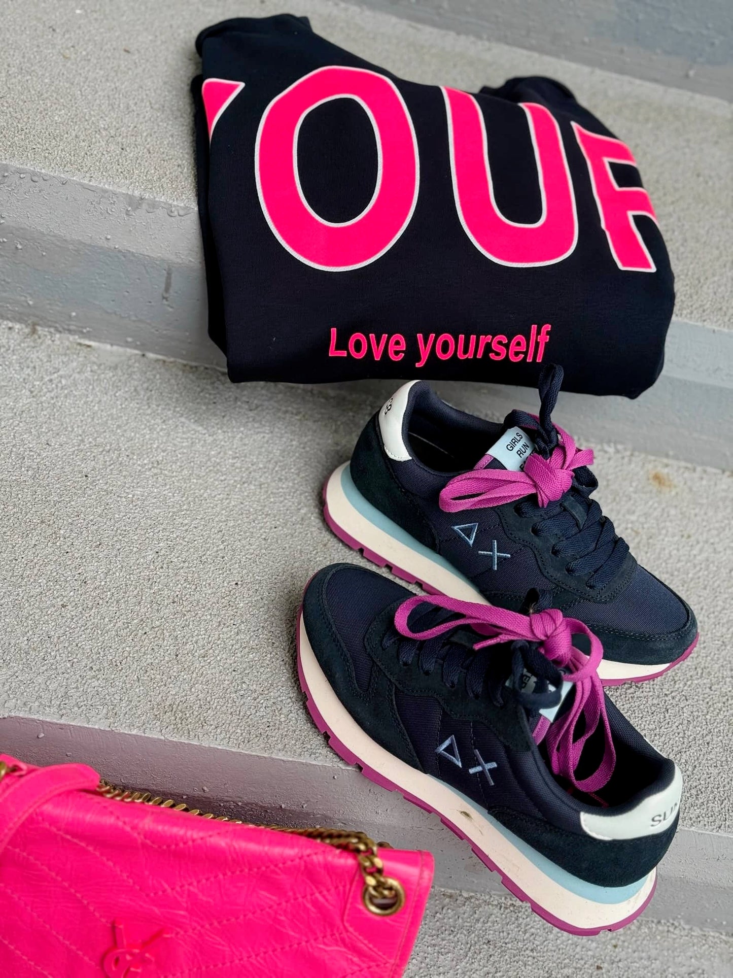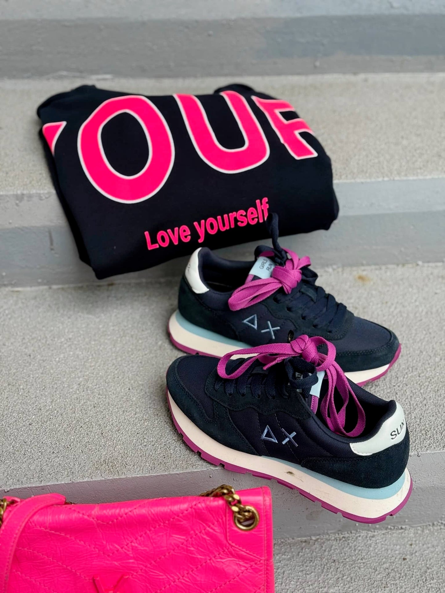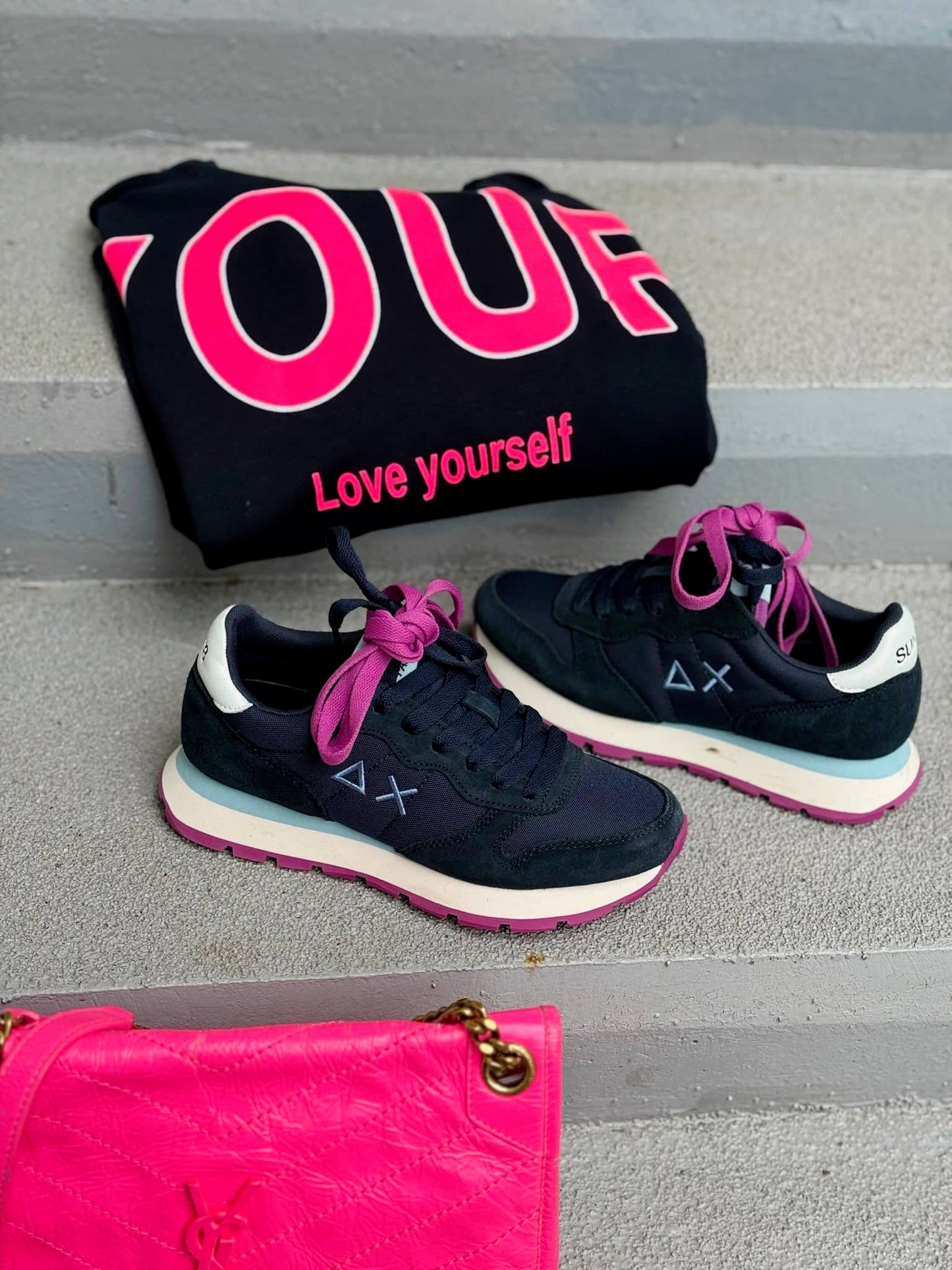 La paire de baskets est vendue avec deux paires de lacets : une mangenta et une bleu marine.