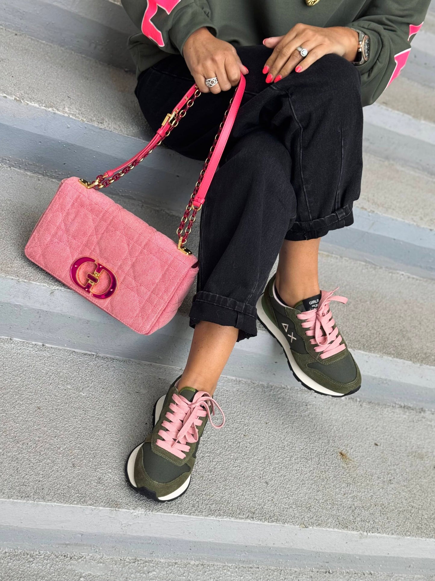 La paire de baskets est vendue avec deux paires de lacets : kaki et rose.